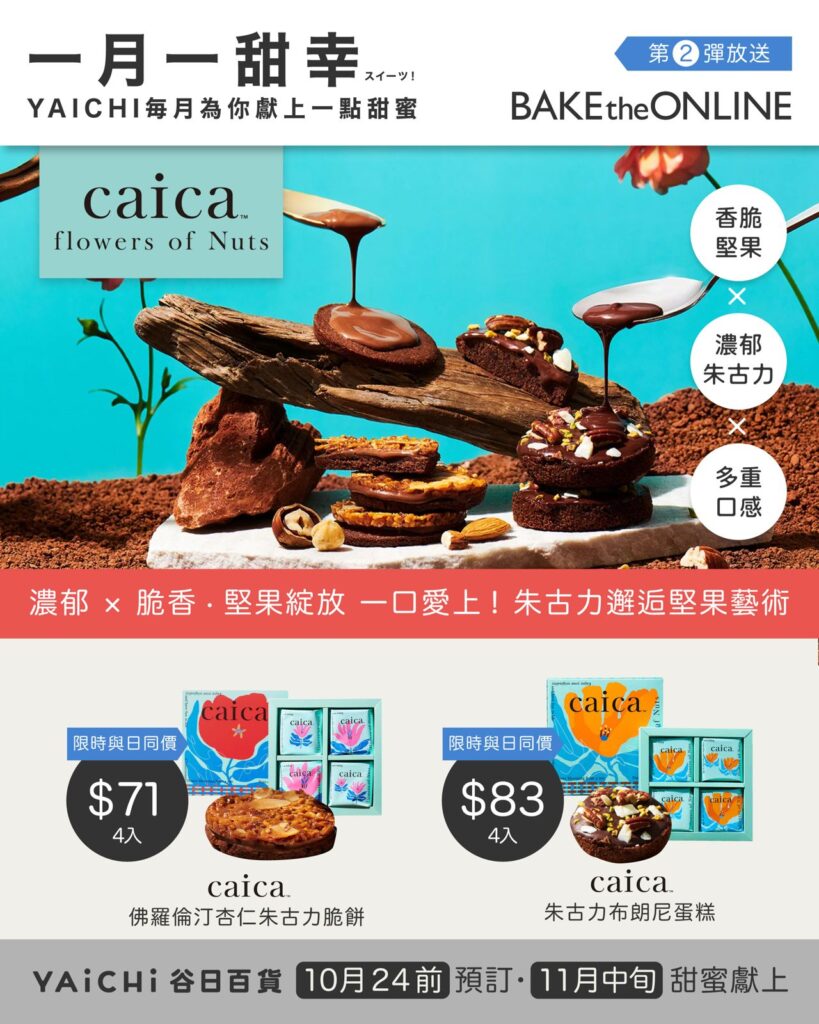 香港最大の日本オンライン百貨店「YAICHI谷日百貨」は、9月よりスタートした「BAKE the ONLINE」にて、予約販売の熱狂を巻き起こしています。第一弾の「BAKE CHEESE TART」と「PRESS BUTTER SAND」に続き、10月10日からの第二弾ではナッツスイーツ専門ブランド「caica」が香港に初上陸します!