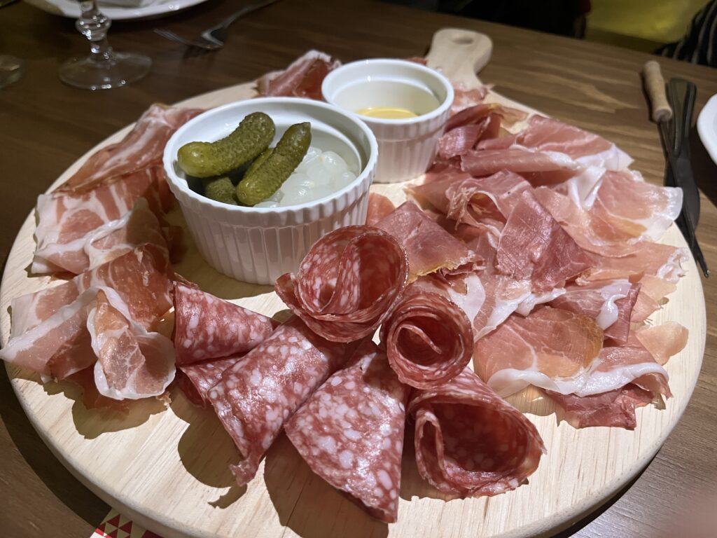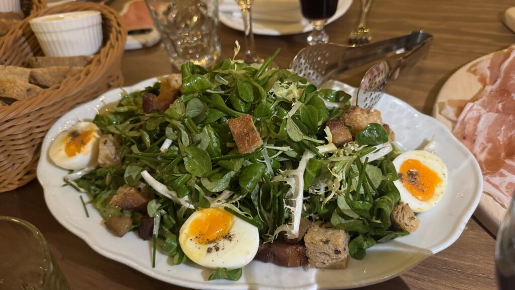 テーブルにまず運ばれてきたのは、クラシックなシャルキュトリーの盛り合わせ。生ハムやサラミなどの伝統的なハム類が木製ボードに美しく並べられ、ワインを誘うラインナップです。そこに合わせて登場したのが「Salade de Mâche Mimosa」。柔らかいマシェ(コーンサラダ)に、卵のミモザ仕立てがアクセントになった、軽やかだけどしっかり味わいのある冬サラダでした。こってり系の料理が続く前の、ちょうどいいウォーミングアップという印象です。