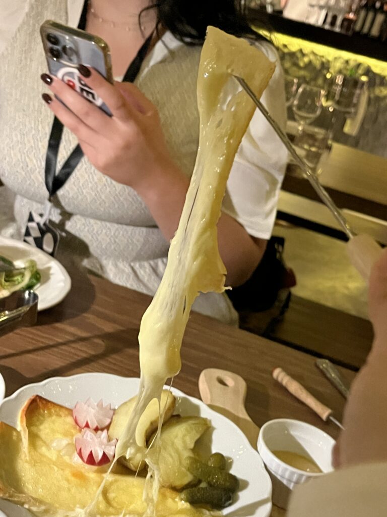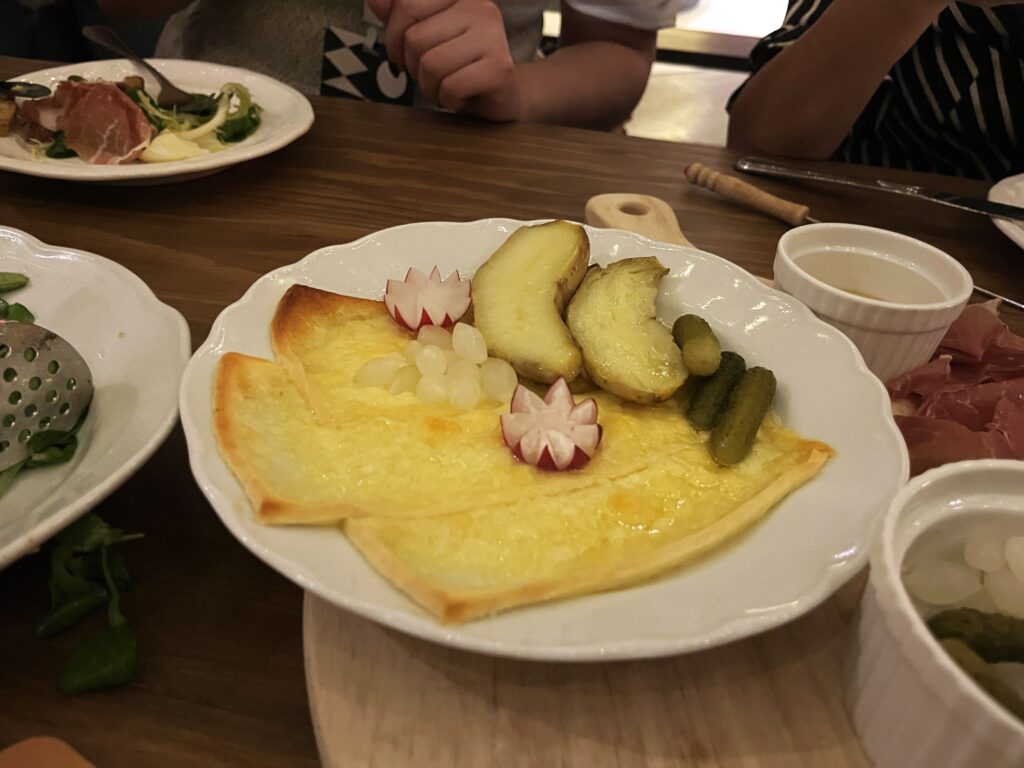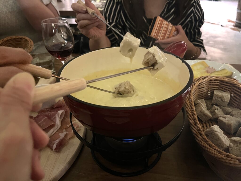 そして、アルプス料理といえばやはり外せないのが、チーズフォンデュ。ここではスイス伝統の「Fondue Moitié-Moitié」が登場します。グリュイエールとエメンタールを半々で使ったレシピで、白ワインがきいた大人の味わい。パンをフォークに刺し、ぐつぐつ煮えたチーズにくぐらせて、ひたすら口へ運ぶという“無限ループ”に突入しました。