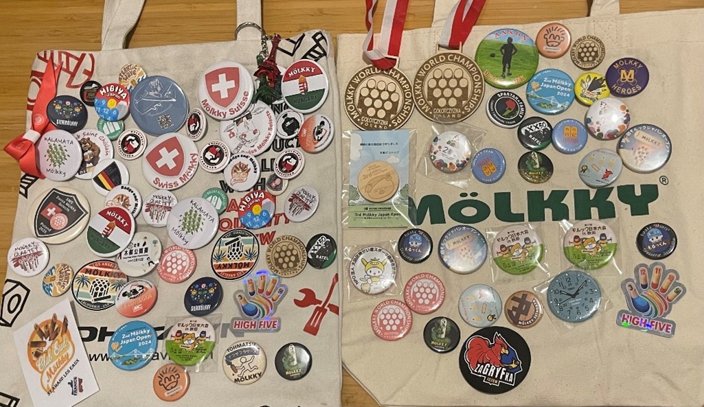 試合が多い世界大会では、一度に30個も40個も集まることがあるので、管理がなかなか大変なのですが、欧米では缶バッジを集めている方もいるようで、対戦していないのに缶バッジだけくれないか、と声をかけられたり、逆に、これどうぞ、と一方的に渡されることもあります。