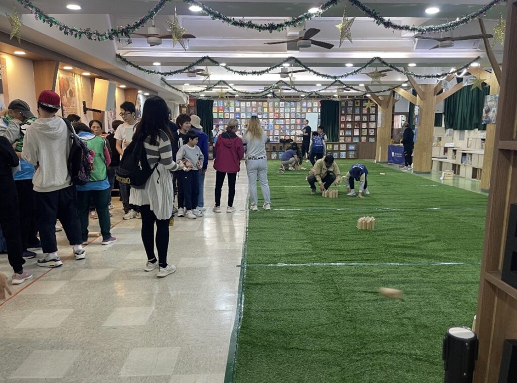 今回、校長先生のRemusさんは、講堂と校庭に合わせて8コートも準備し、更に新品のモルックセットを4つも購入してくれました。