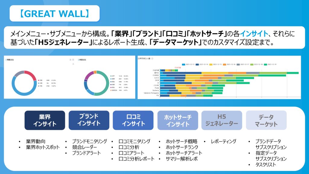「我々の強みは、実際に現地で培った経験です」と山本氏。田氏も「広州や東京でインバウンドや越境ECを手掛ける中で、企業が中国の巨大市場に正しくアプローチできていない現実を見た」と語ります。こうして誕生したのが、日中間のデータ壁“グレートファイヤーウォール”を超え、中国現地の情報を正規ルートで日本へ届けるデータ&AIサービス【GREAT WALL】でした。