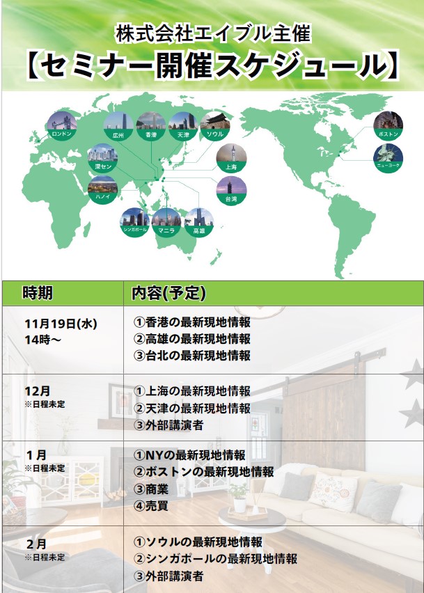 株式会社エイブル主催。今回は「香港/台湾(台北・高雄)の最新住宅情報」に特化し、現地情報に精通するプロが皆さまの疑問を解消します!