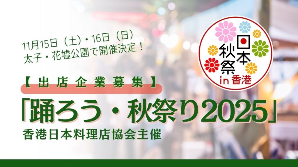 今年も「踊ろう・秋祭り2025」を、11月15日(土)・16日(日)に花墟公園(Fa Hui Park)で開催します。この秋祭りは、いつも日本を愛し応援してくださる香港の皆様への感謝を込めて、日本料理の魅力や日本文化への親しみをさらに深めていただくことを目的に毎年開催しています。