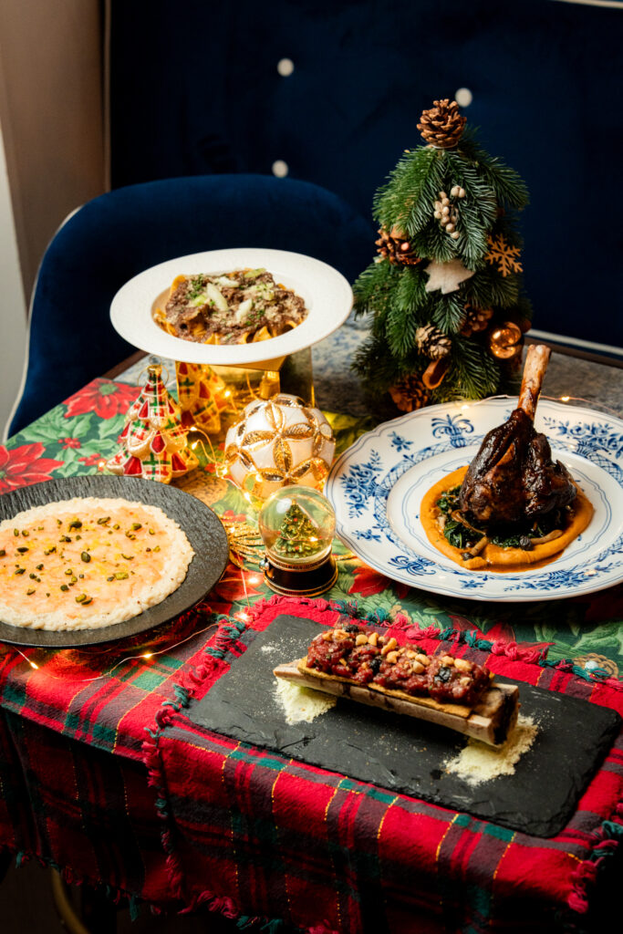 映画の世界観を感じる華やかな空間「Casa Sophia Loren」で、特別な夜を演出。この時季提供されるディナーセットは前菜1種、メインはラムシャンクや牛テンダーロインなどのラインナップから、デザートはティラミスなどから選べます。クラシックなイタリア料理で聖なる夜をワイワイ過ごそう!