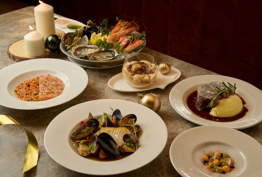 ホテルダイニングの上質さをカジュアルに楽しめる「UMAMI」では、クリスマスイブと当日に特別なセットディナーを提供。キャビアや新鮮な海鮮、鹿児島A5和牛、アワビなど、プレミアム食材をふんだんに使った贅沢なラインナップです。洗練された和のスタイルで、五感を刺激する逸品が並びます。