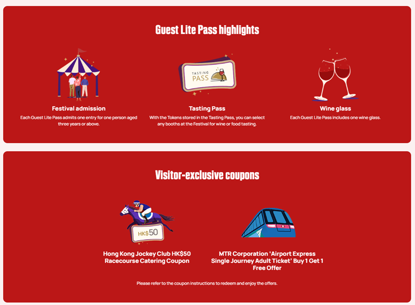 グランドワインテイスティングパス入場券1枚(HK$40)16トークン(HK$400)グランドワイングラス1杯(HK$200)グランドワインパビリオンアクセス(スナック付き)クーポン(HK$200) HK$840相当598香港ドル