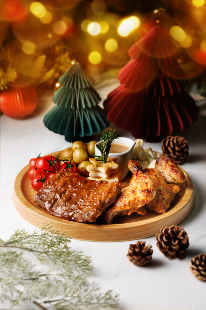 ハーブマリネのスプリングチキンとジューシーなポークリブを豪快に盛り合わせたシェアプレート。